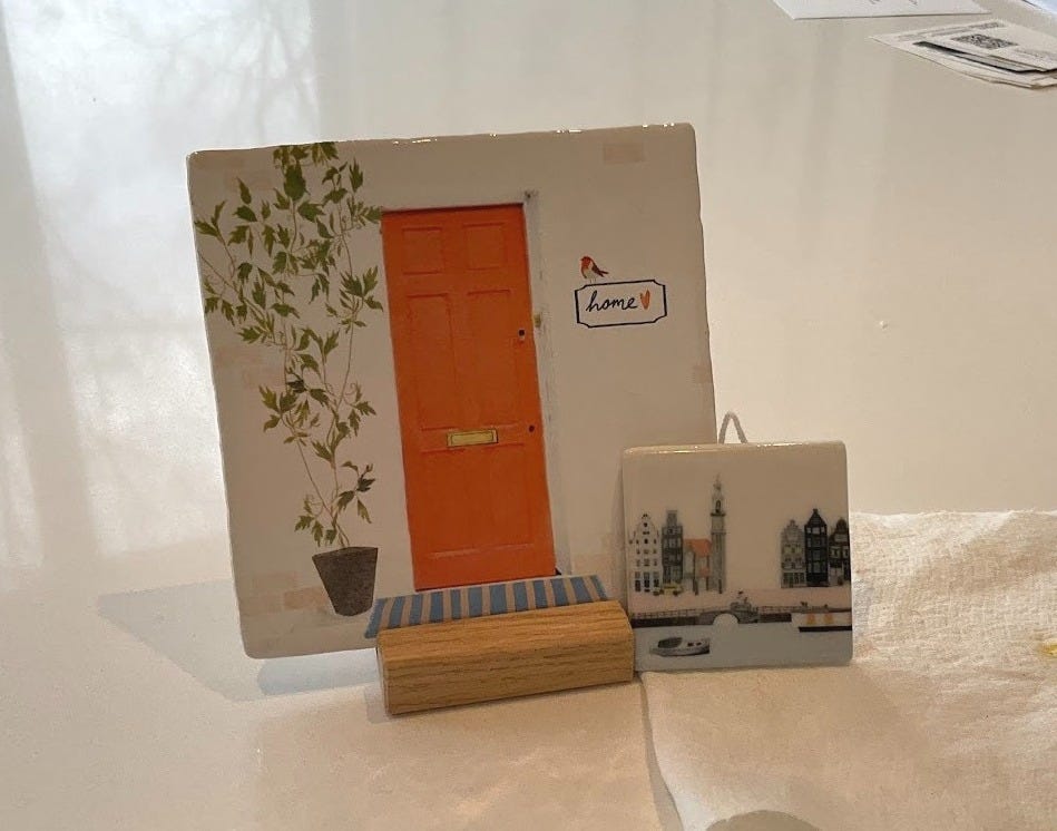 Then, one particular storefront sliced through my brain fog. Wait, I recognized this display: beautiful painted tiles. Hannah had given me a tiny one with a delicate painting of Amsterdam when I visited her here last year. My eyes scanned the tiles in the window until one lassoed me in: a delicate orange door, a climbing green plant, a welcome mat striped with blue, and a little bird perched on a sign that simply read: home.